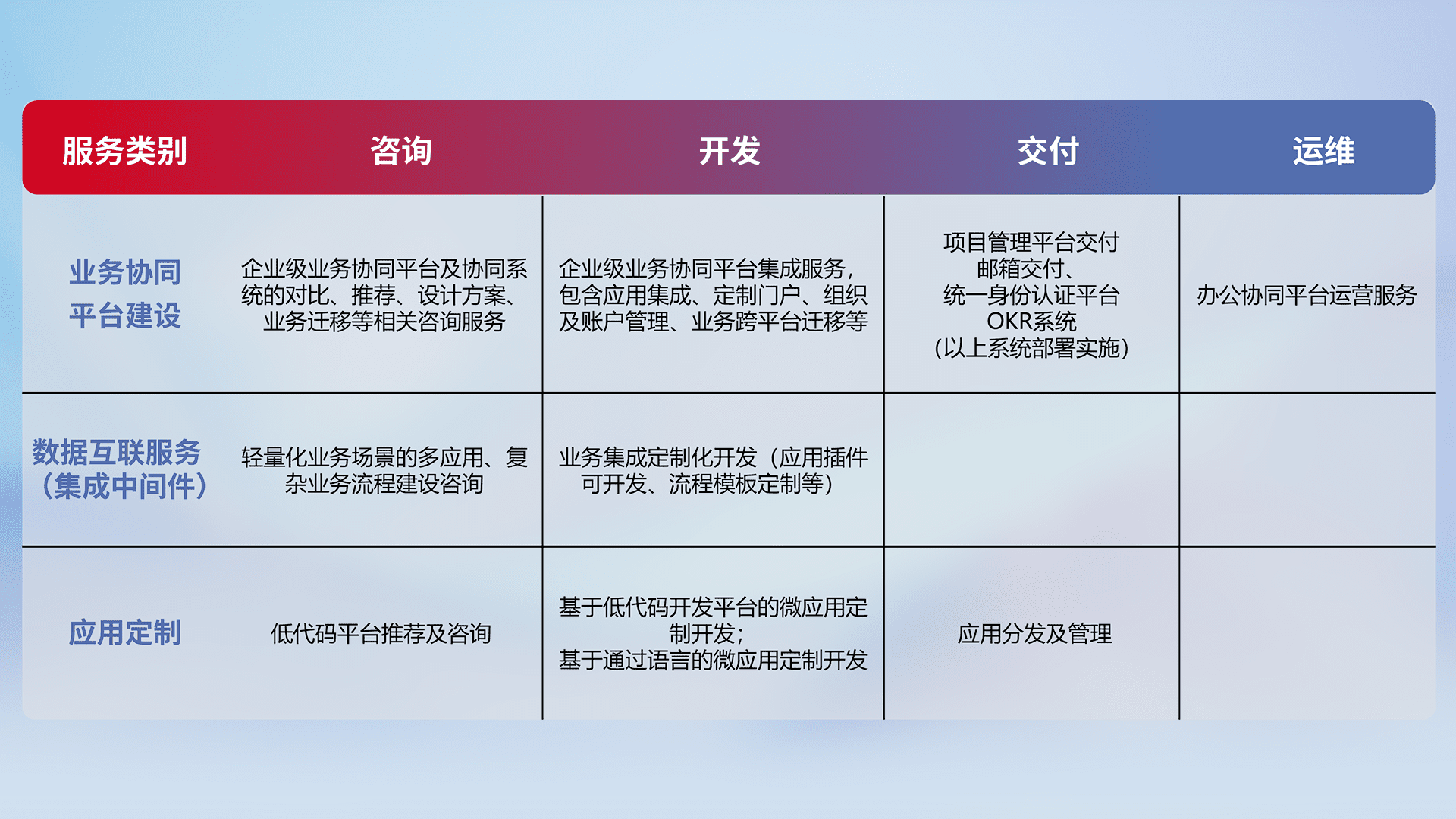 针对钉钉、、、、企微、、、、IDaas等平台级产品提供产品的规划、、方案、、、、交付、、定制化开发等服务,,实现如统一协同办公、、、智能客户服务、、、混合会议管理、、智能数据查询、、、等业务场景,,,,实现数字化转型。。。。